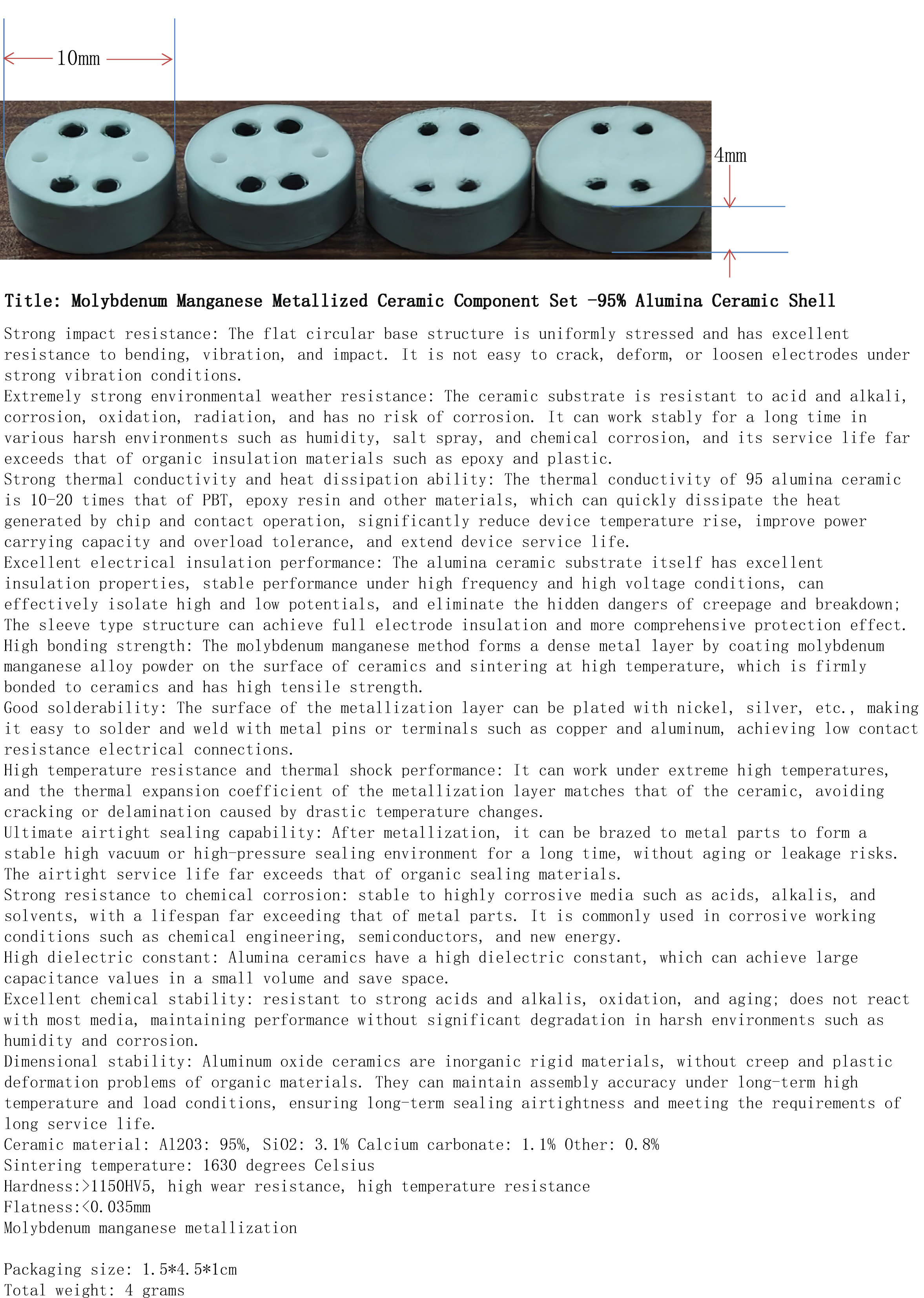| 高结合强度:钼锰法通过在陶瓷表面涂覆钼锰合金粉并高温烧结,形成致密金属层,与陶瓷结合牢固 | |||||||||