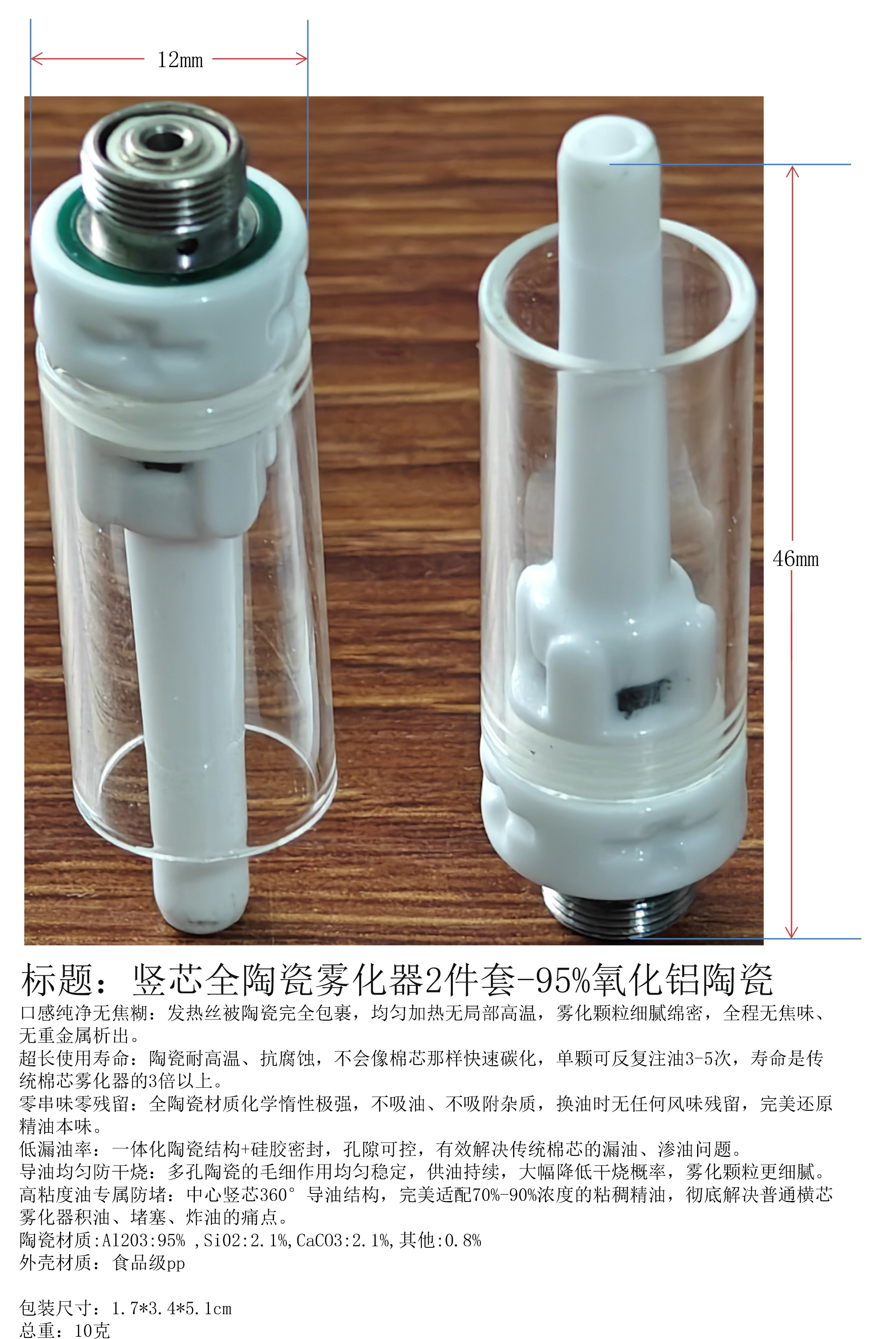 产品名称:竖芯全陶瓷雾化器2件套-95%氧化铝陶瓷
