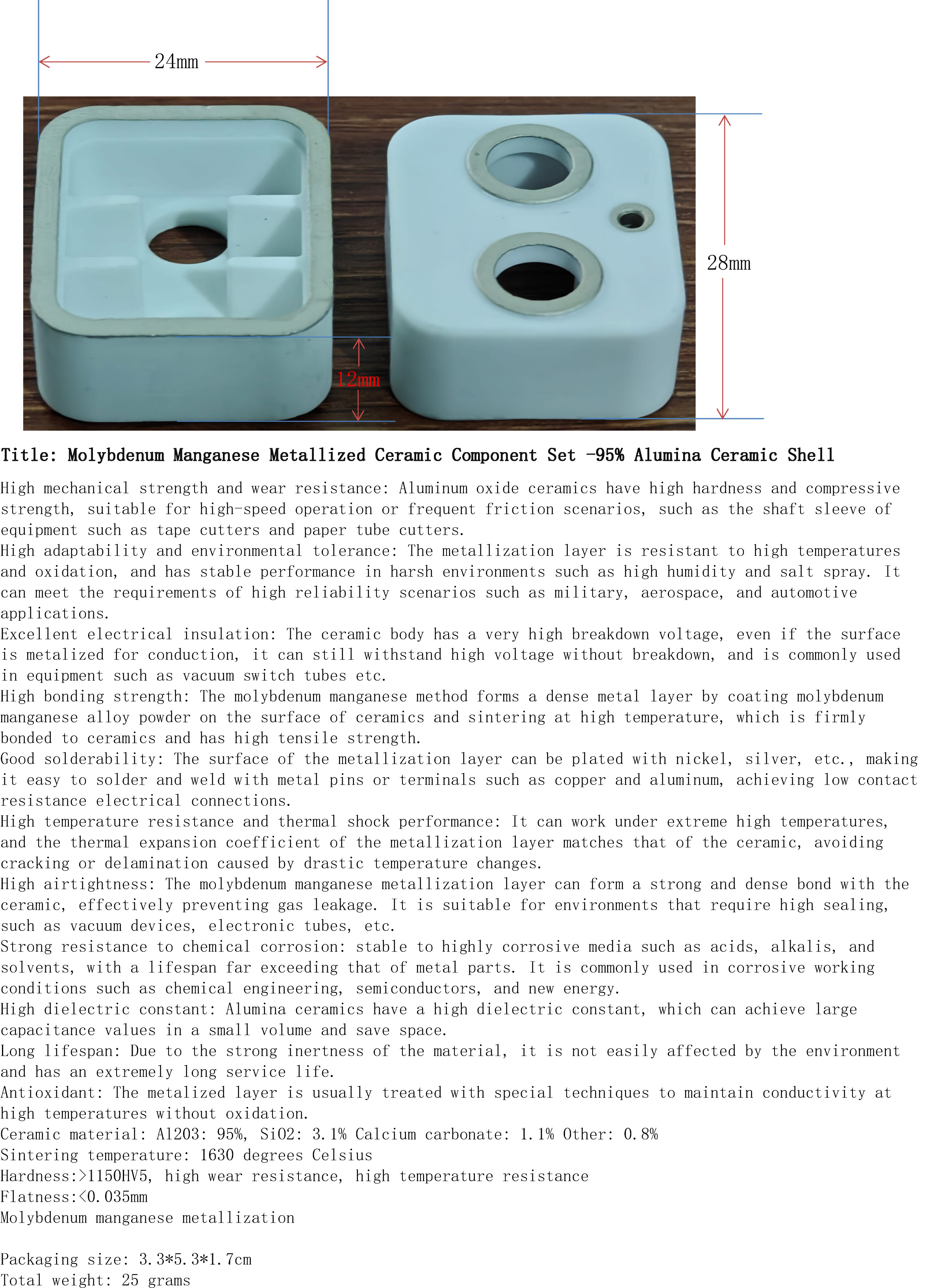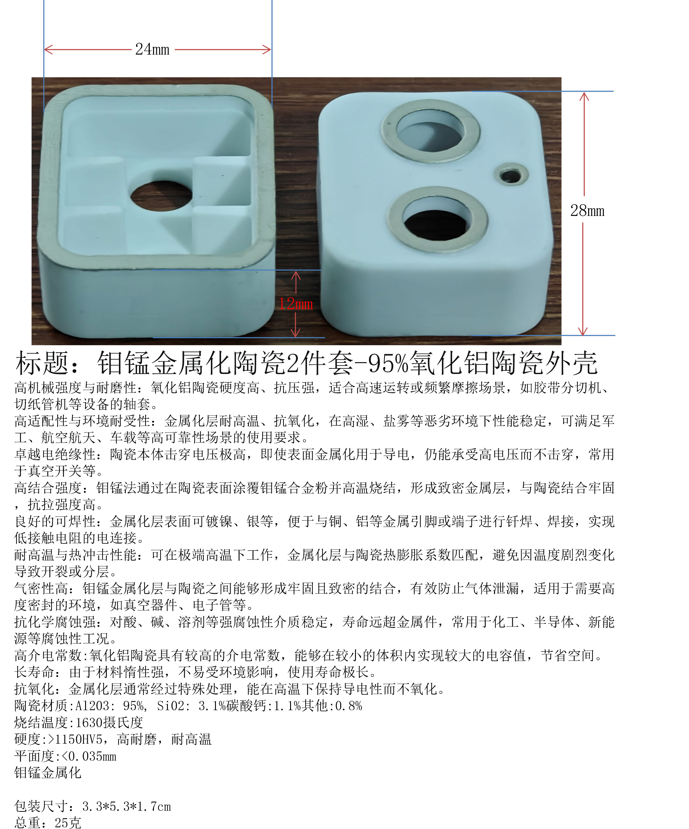 产品名称:钼锰金属化陶瓷2件套-95%氧化铝陶瓷外壳