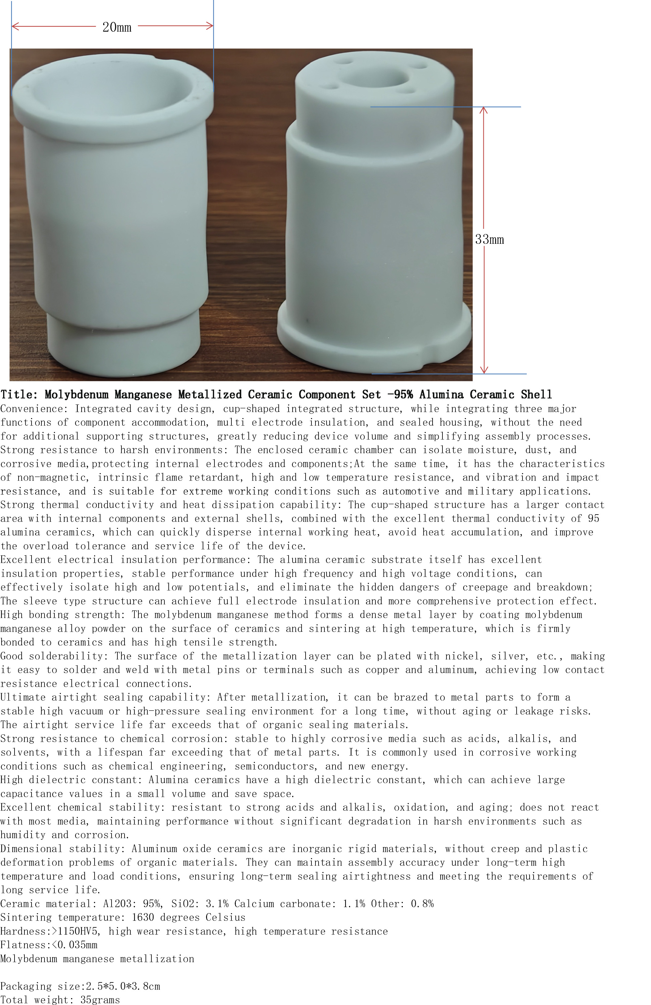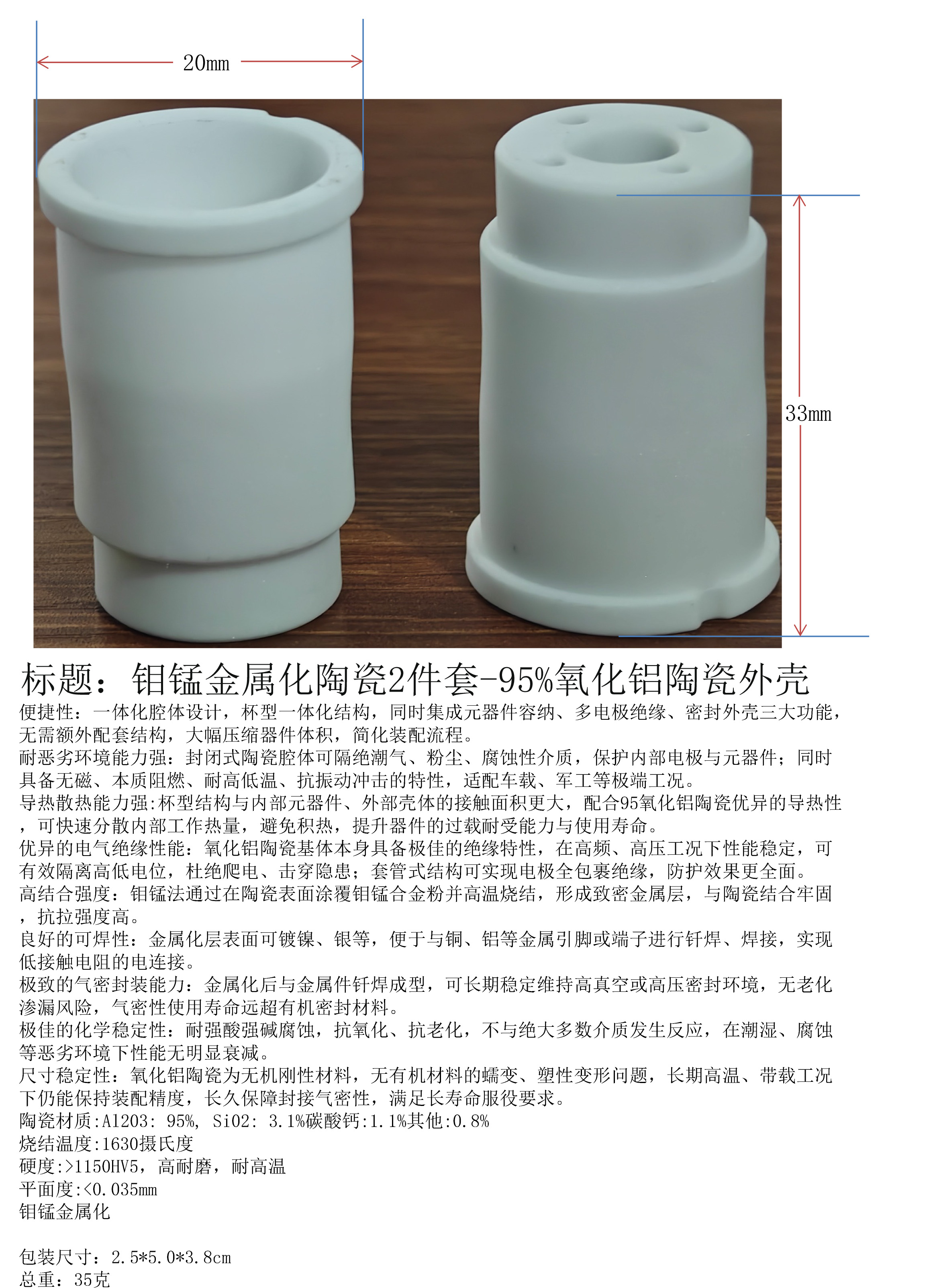 产品名称:钼锰金属化陶瓷2件套-95%氧化铝陶瓷外壳