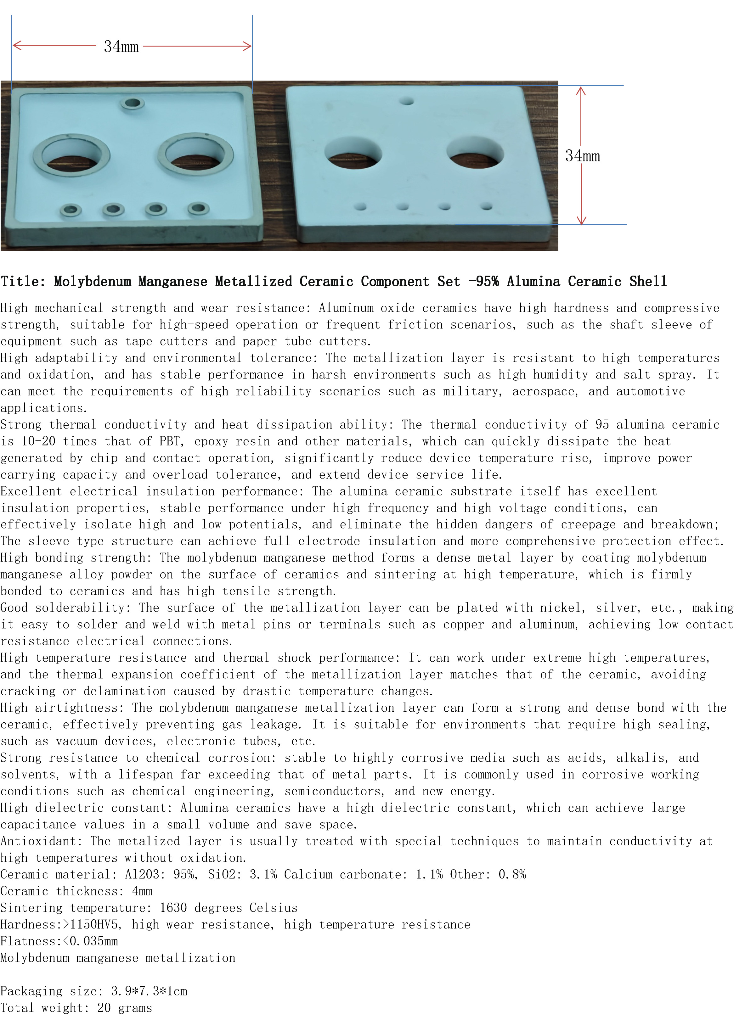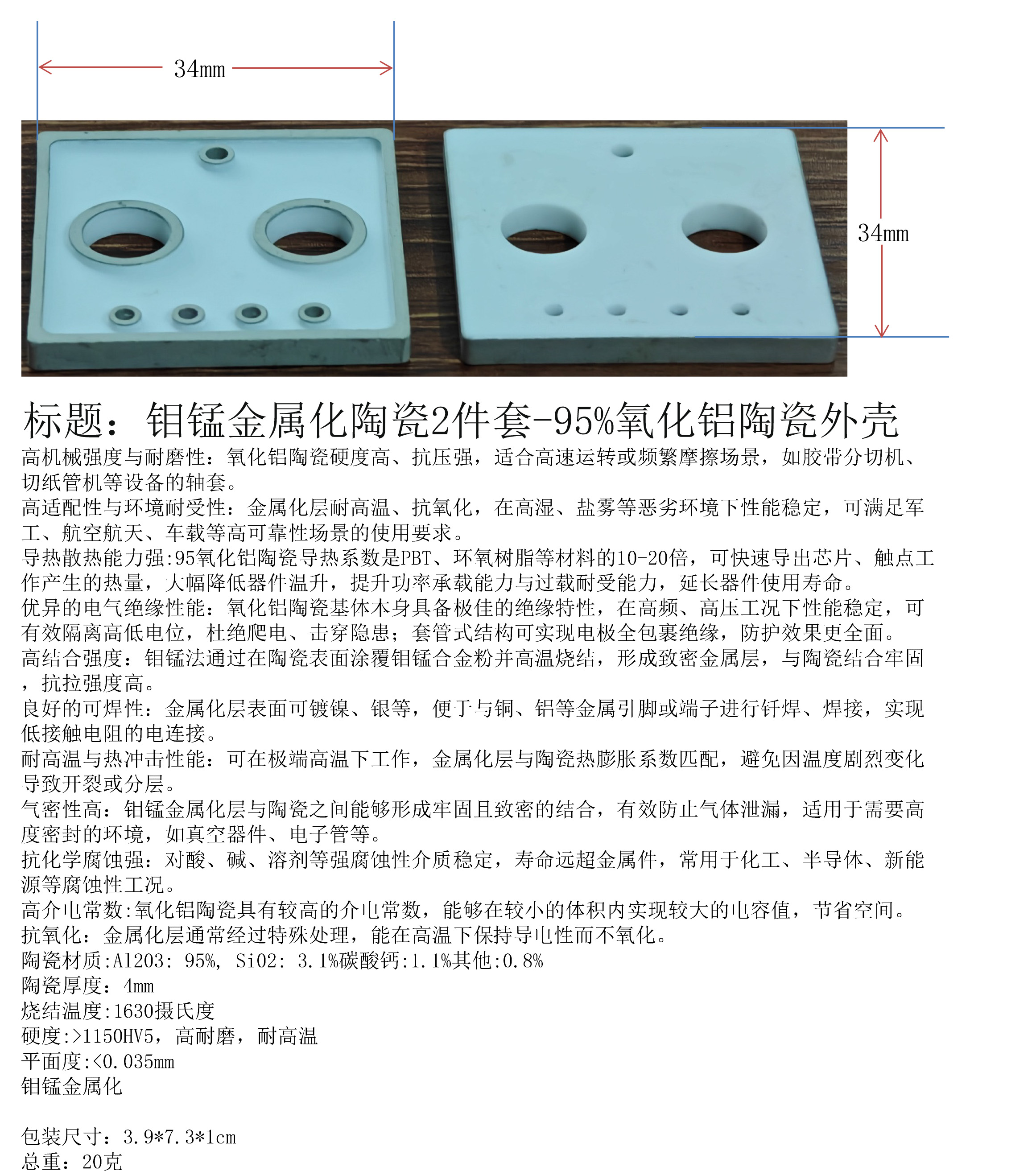 产品名称:钼锰金属化陶瓷2件套-95%氧化铝陶瓷外壳