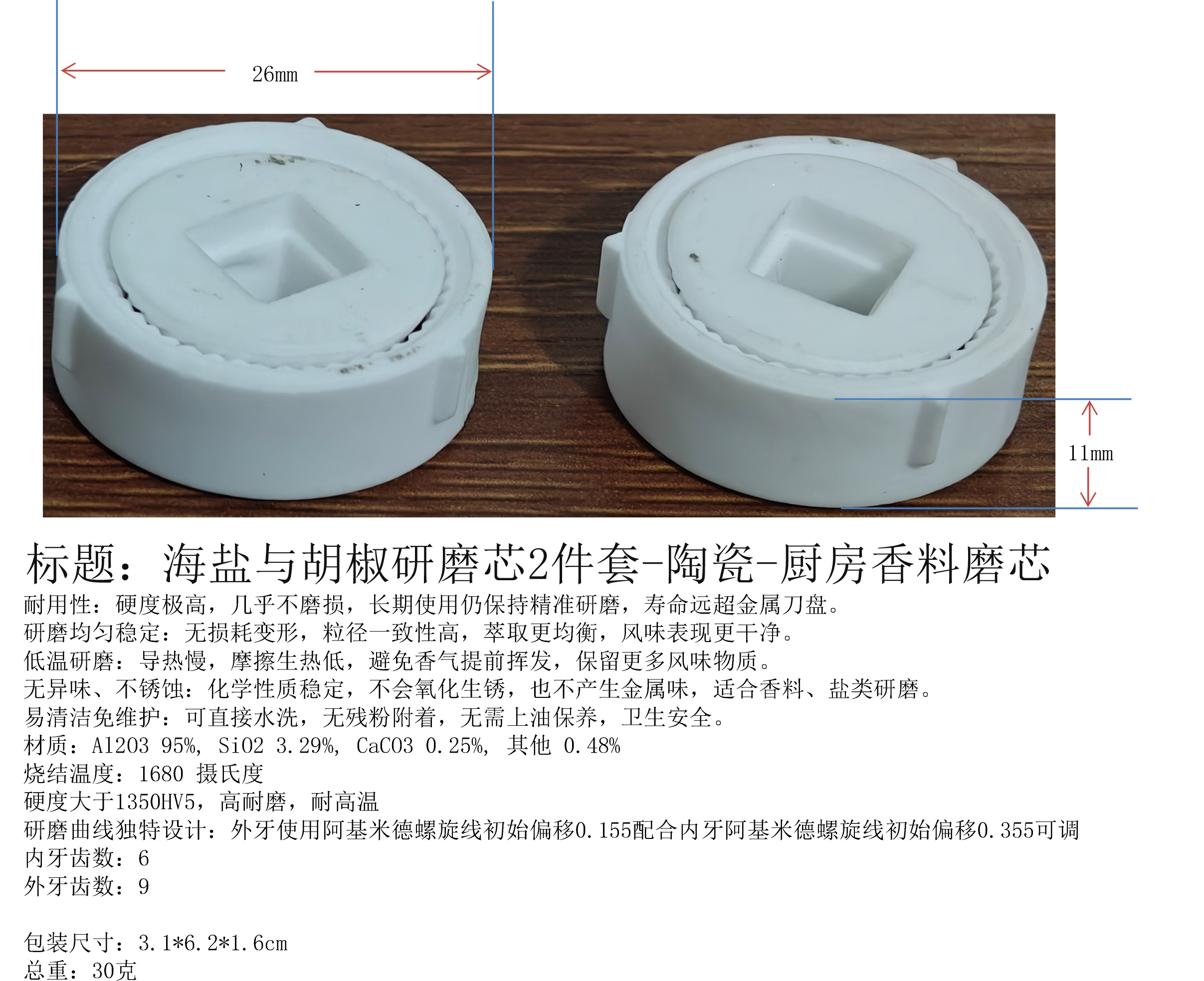 研磨芯材质:Al2O3 95%, SiO2 3.29%, CaCO3 0.25%, 其他 0.48%