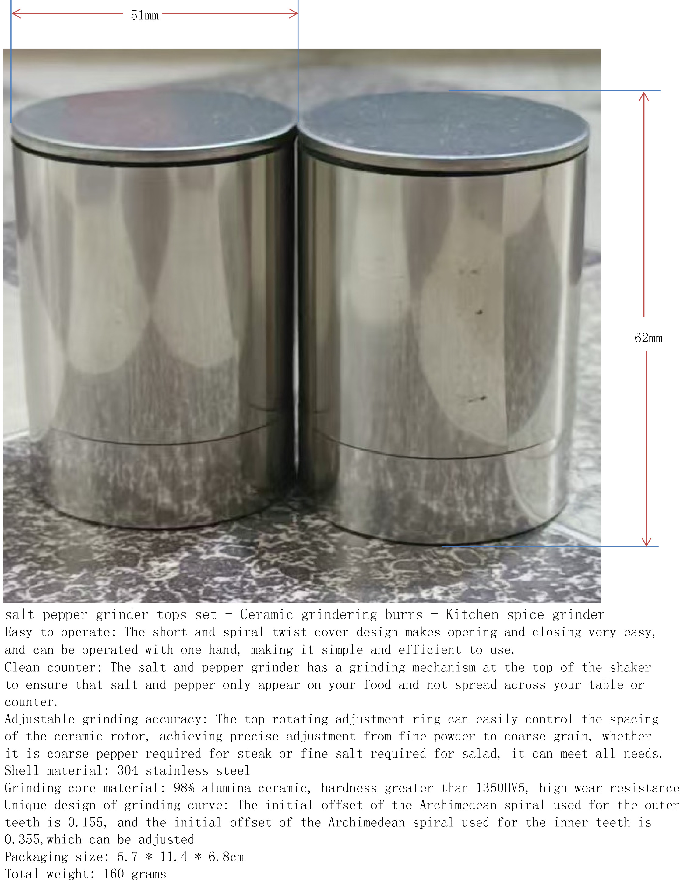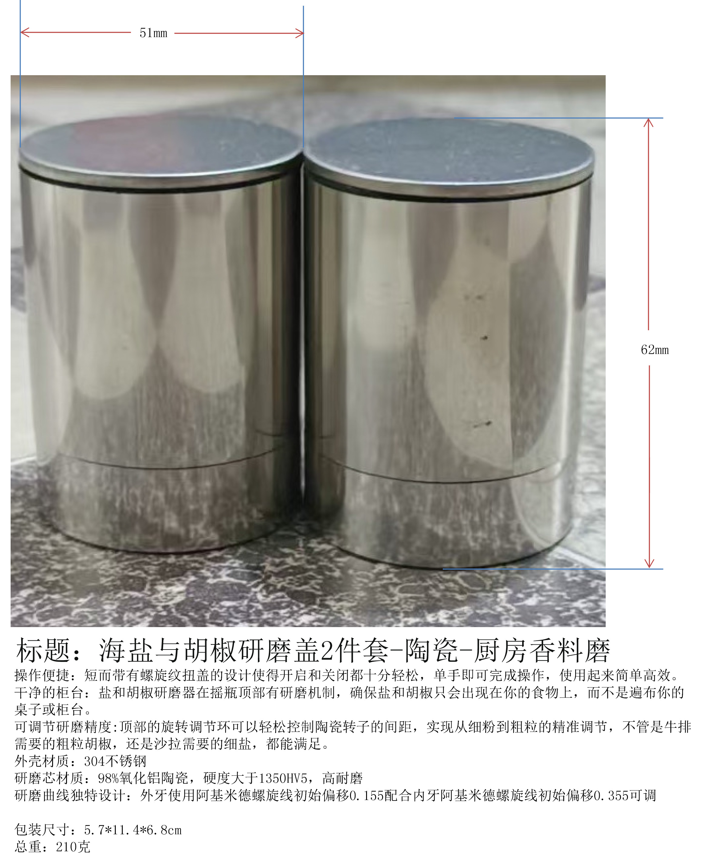 产品名称:海盐与胡椒研磨盖2件套-陶瓷-厨房香料磨