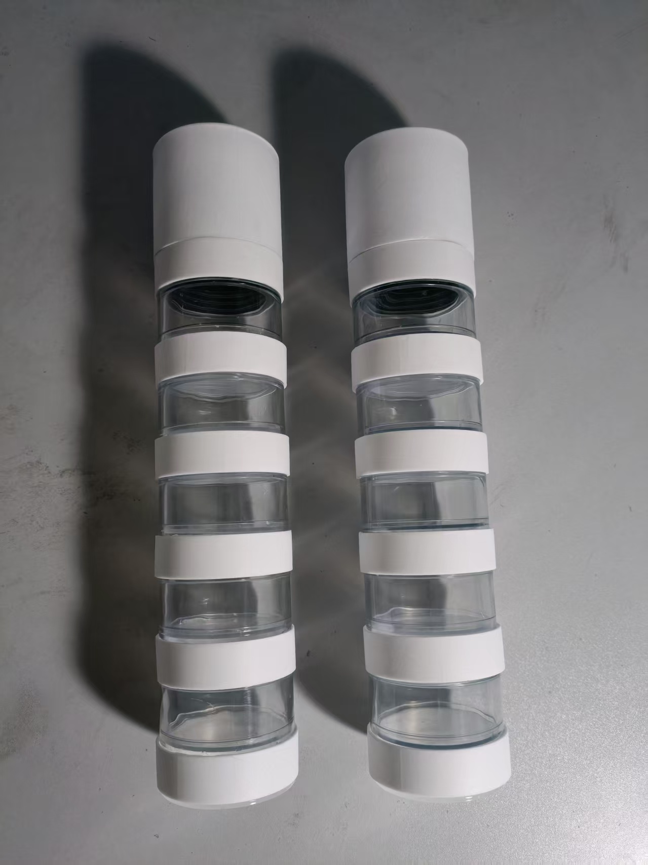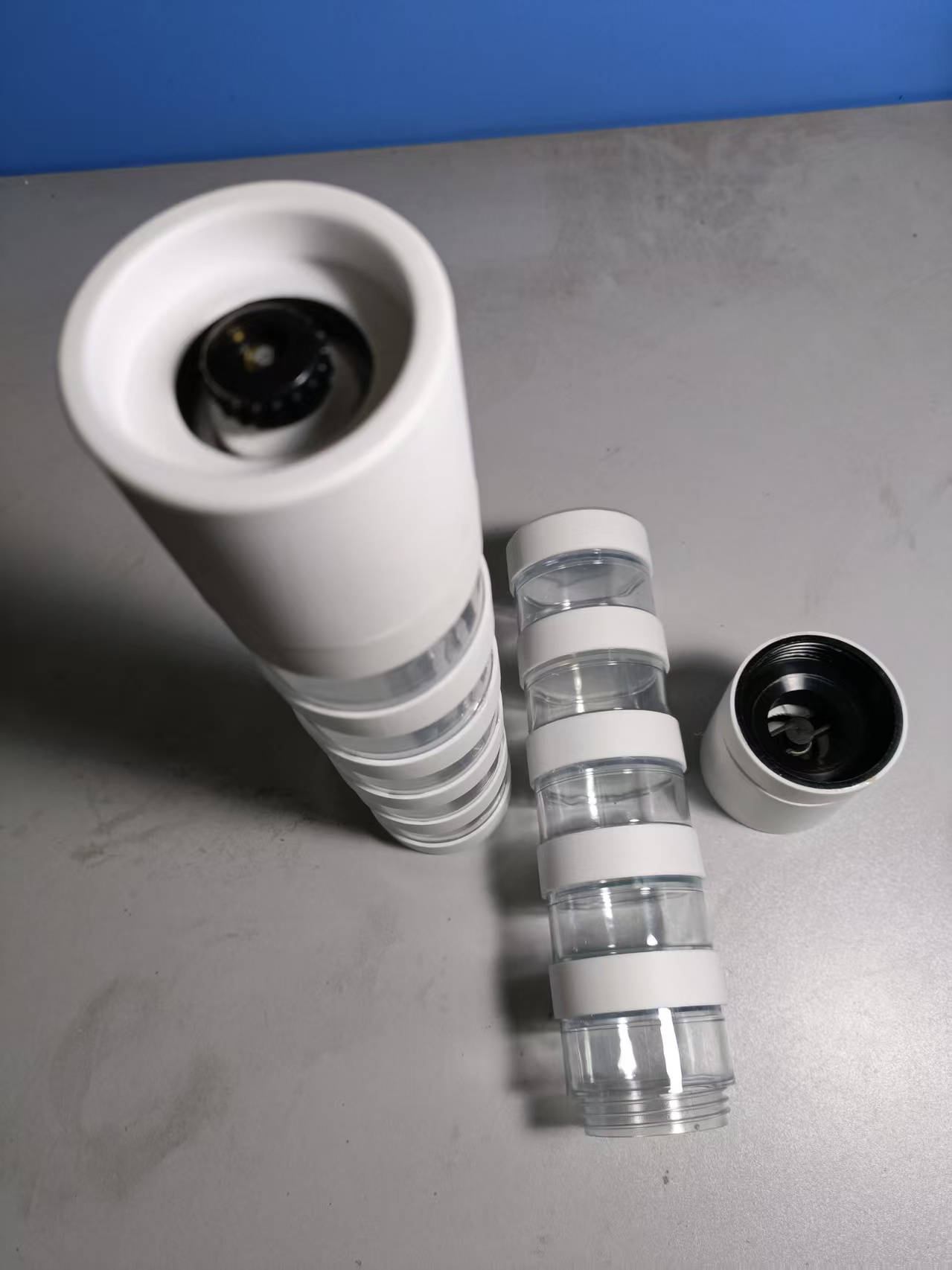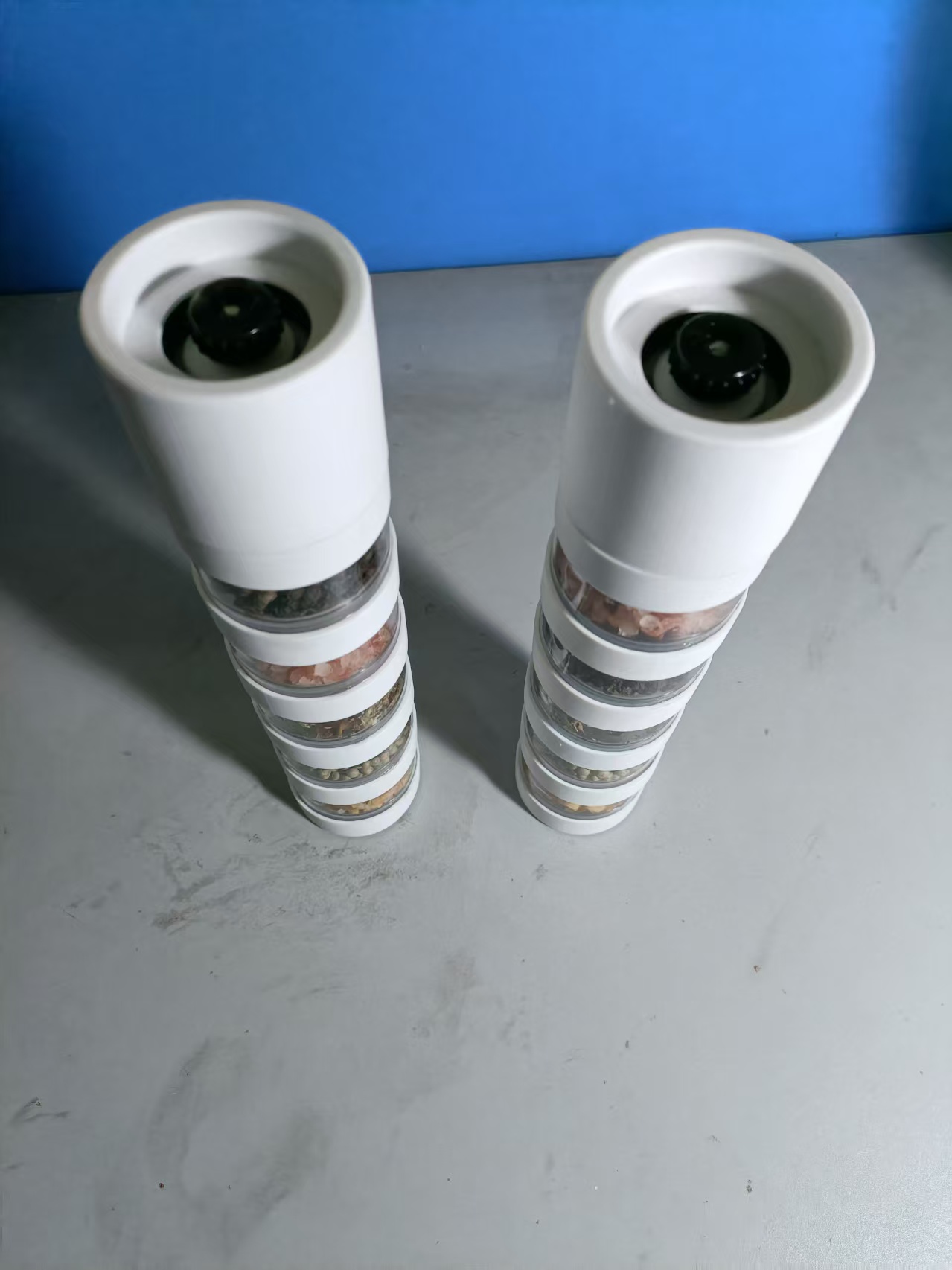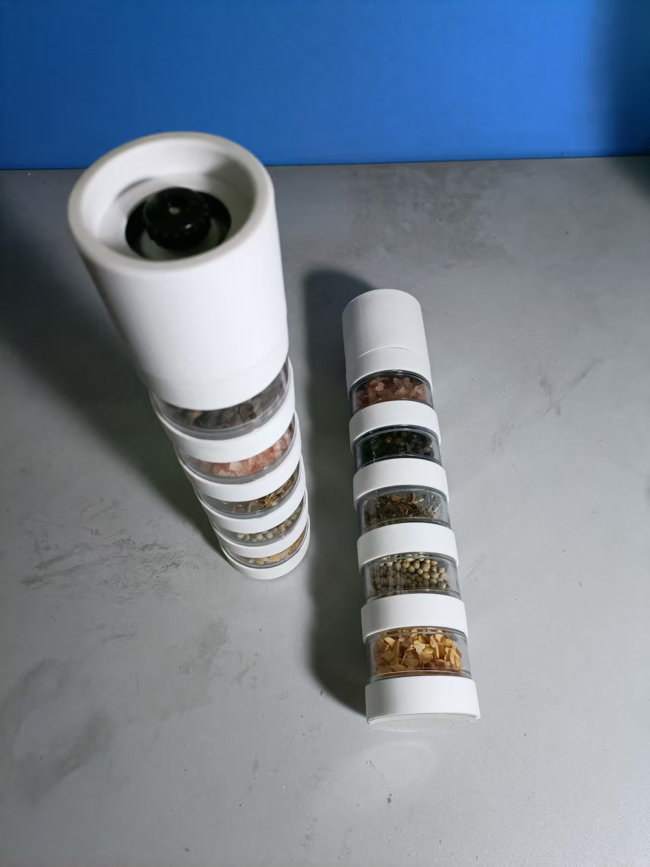 多功能性:可以同时容纳多种不同的香料或调料,如胡椒、盐、香草等,满足多样化的调味需求,无需准备多个单一功能的研磨器,一共有五层,想用哪层的香料,只需要将对应层数的罐子扭出放置研磨器下方即可。