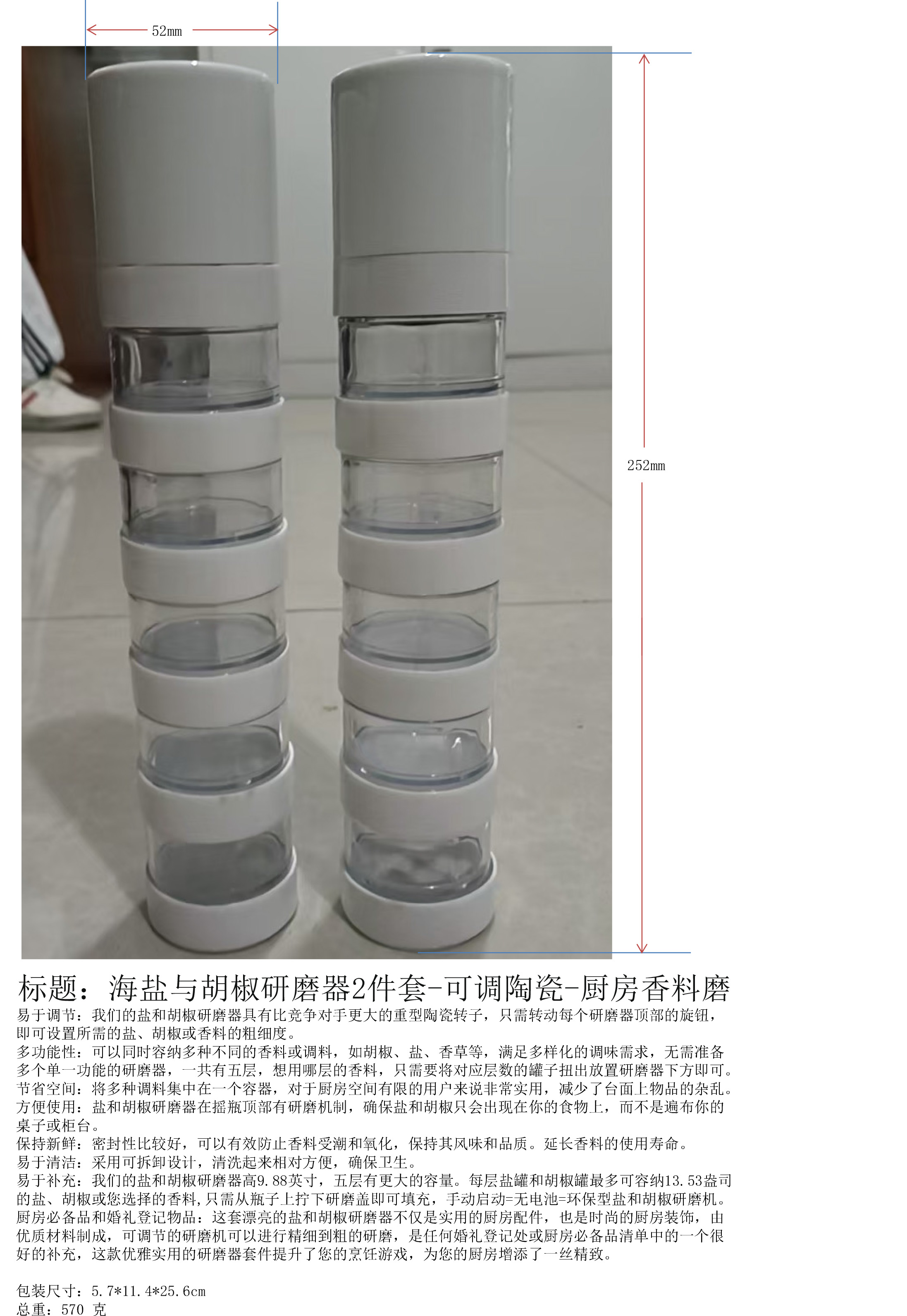 易于补充:我们的盐和胡椒研磨器高9.88英寸,五层有更大的容量。每层盐罐和胡椒罐最多可容纳13.53盎司