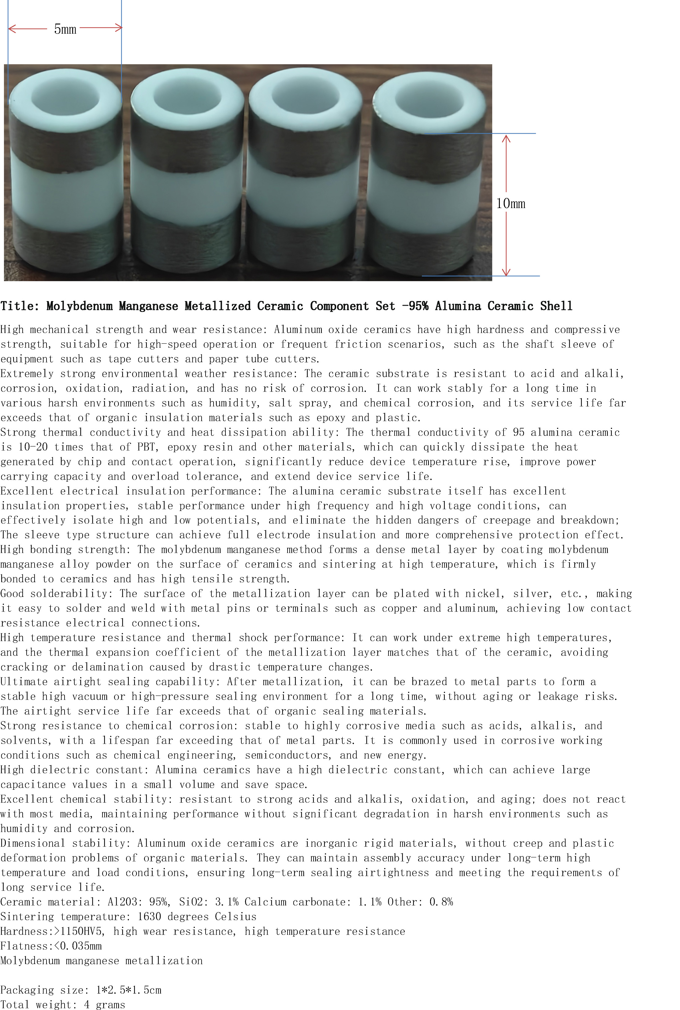 | 高结合强度:钼锰法通过在陶瓷表面涂覆钼锰合金粉并高温烧结,形成致密金属层,与陶瓷结合牢固 | ||||||||||