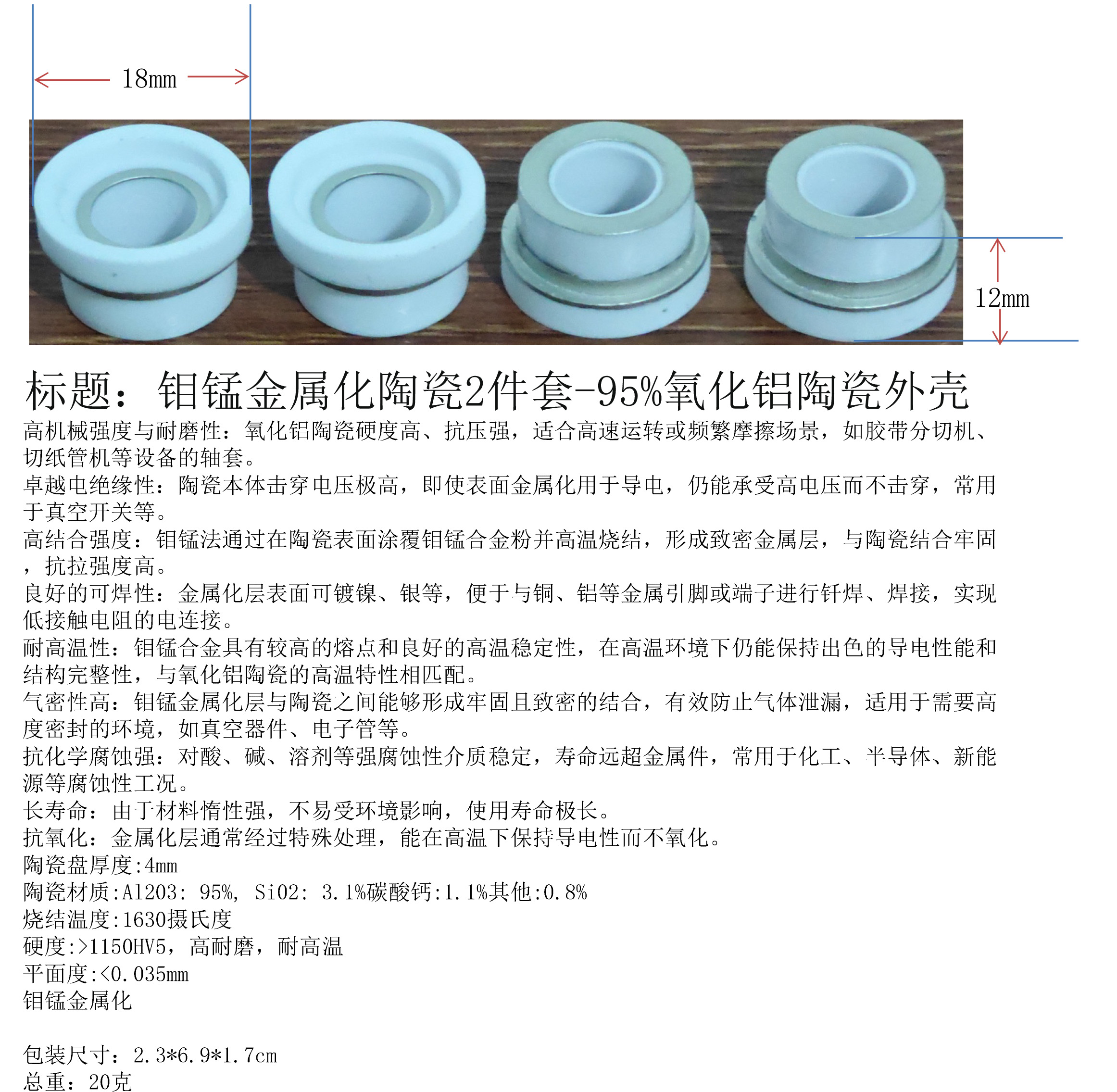 产品名称:钼锰金属化陶瓷2件套-95%氧化铝陶瓷外壳