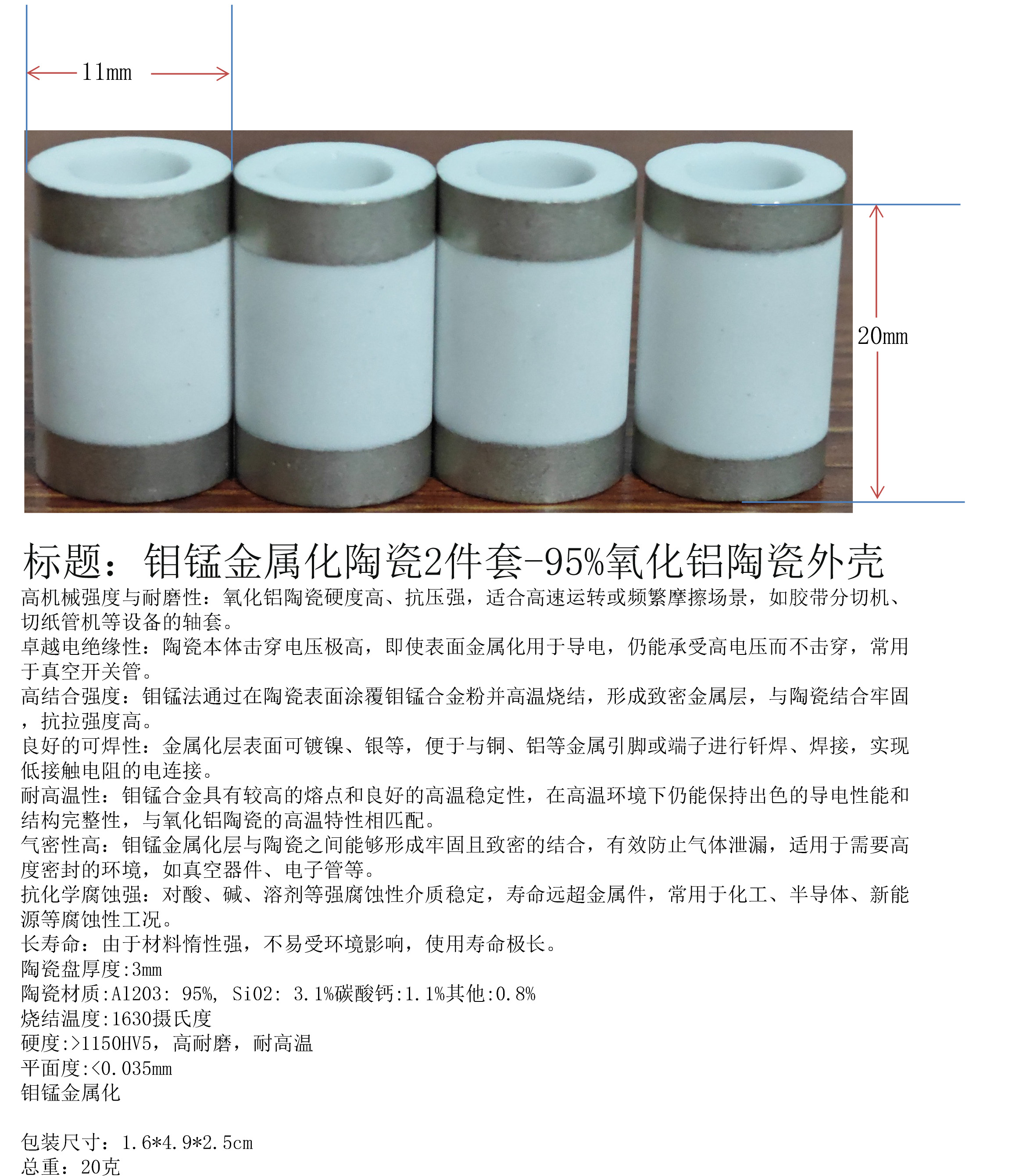 气密性高:钼锰金属化层与陶瓷之间能够形成牢固且致密的结合,有效防止气体泄漏,适用于需要高