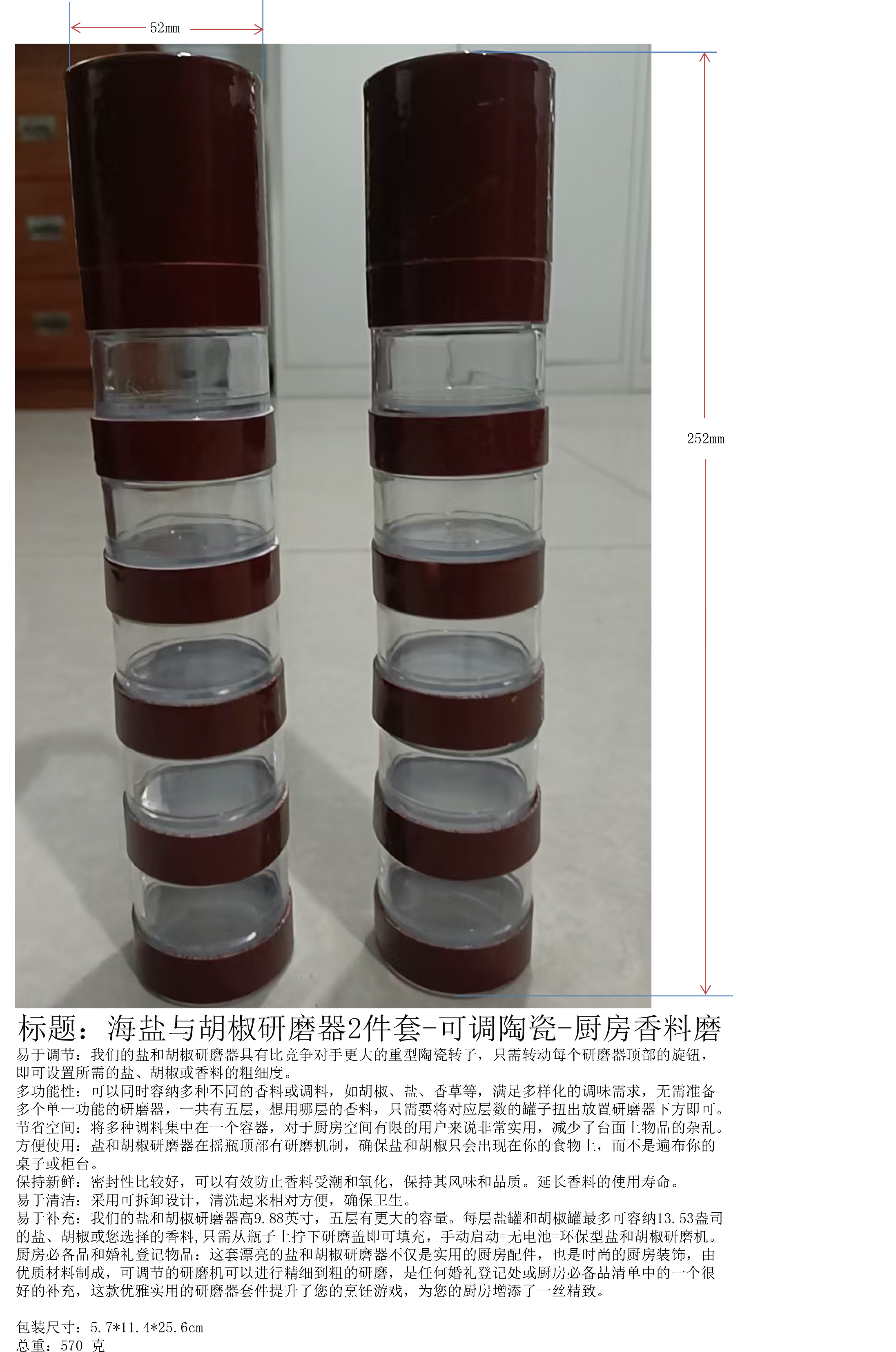 易于补充:我们的盐和胡椒研磨器高9.88英寸,五层有更大的容量。每层盐罐和胡椒罐最多可容纳13.53盎司