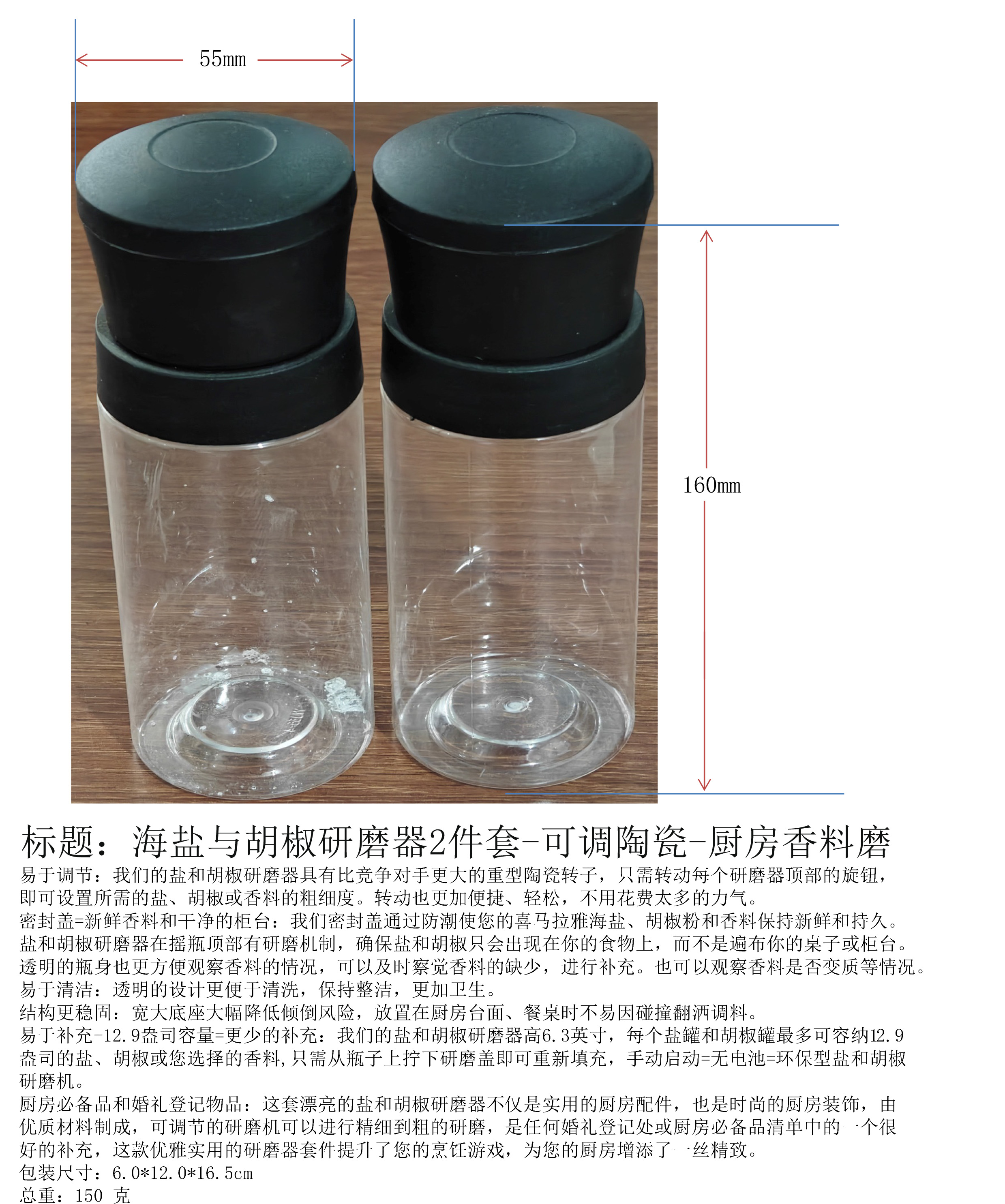| 易于补充-12.9盎司容量=更少的补充:我们的盐和胡椒研磨器高6.3英寸,每个盐罐和胡椒罐最多可容纳12.9 | |||||||||||