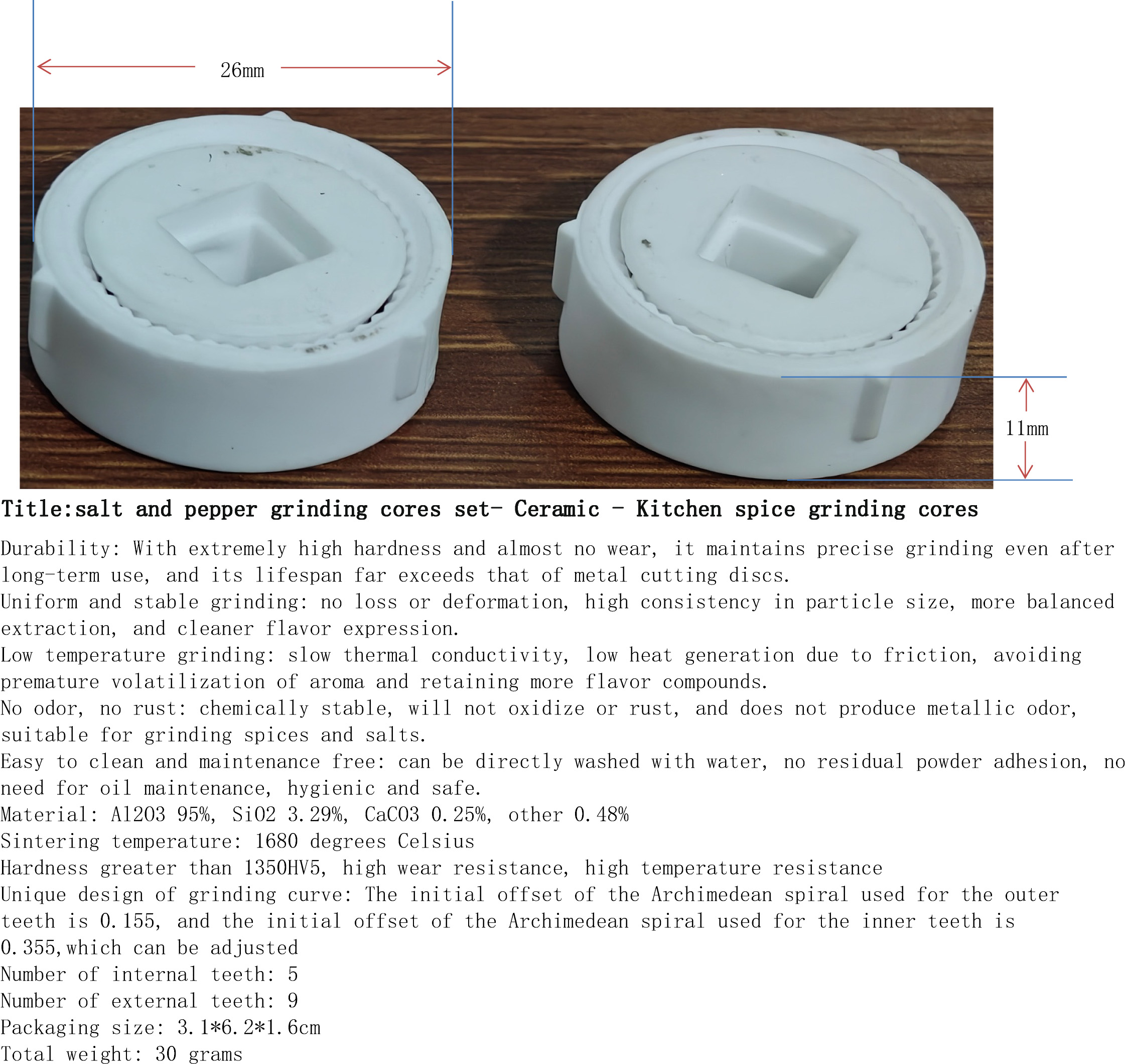 研磨芯材质:Al2O3 95%, SiO2 3.29%, CaCO3 0.25%, 其他 0.48%