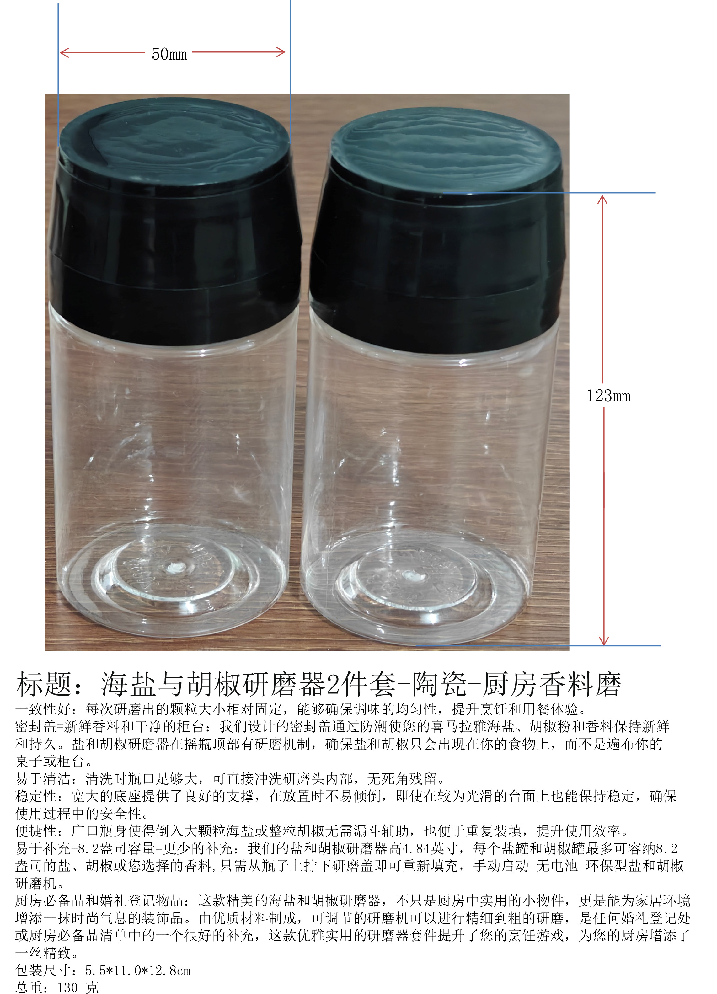 | 易于补充-8.2盎司容量=更少的补充:我们的盐和胡椒研磨器高4.84英寸,每个盐罐和胡椒罐最多可容纳8.2 | |||||||||||