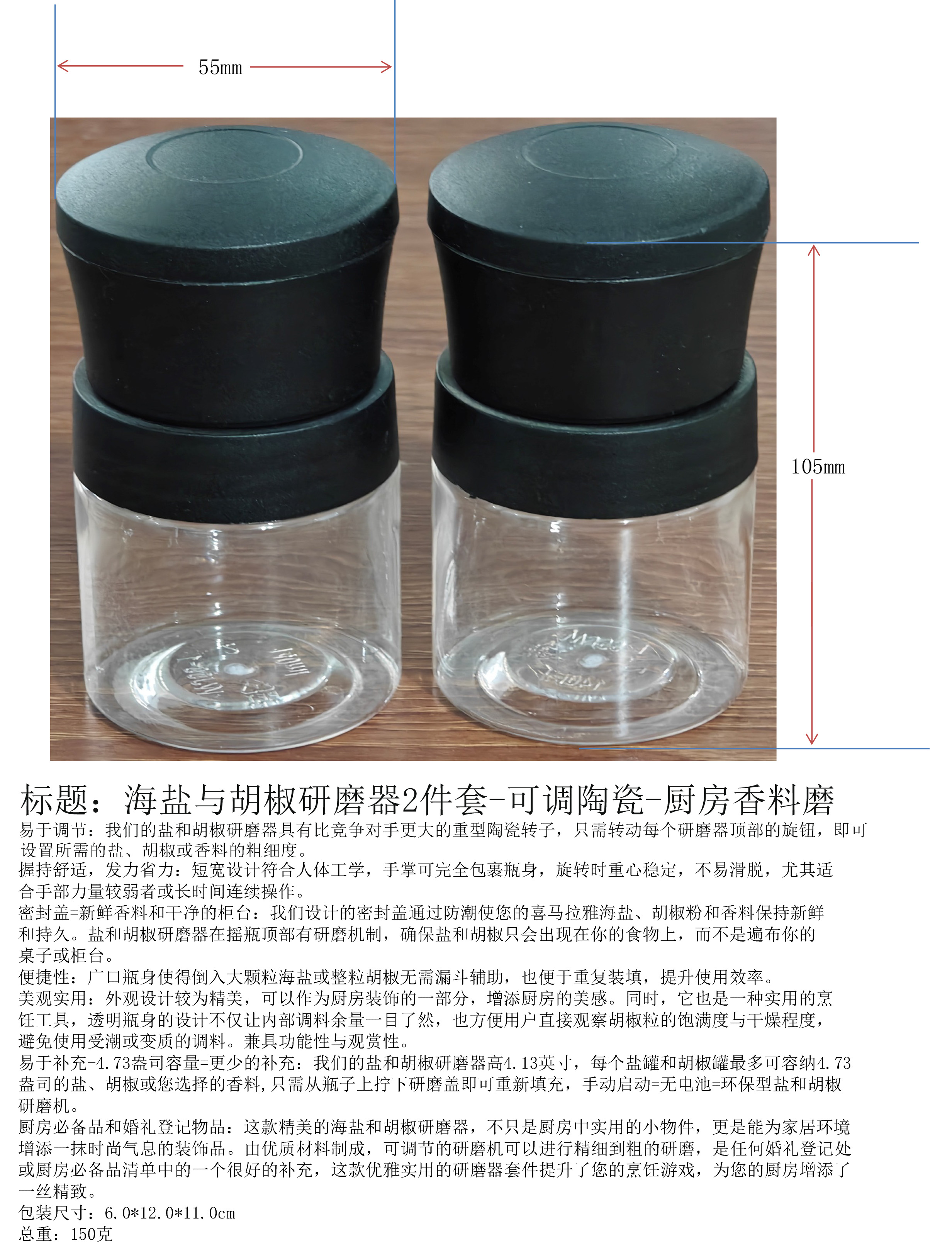 产品名称:海盐与胡椒研磨器2件套-可调陶瓷-厨房香料磨