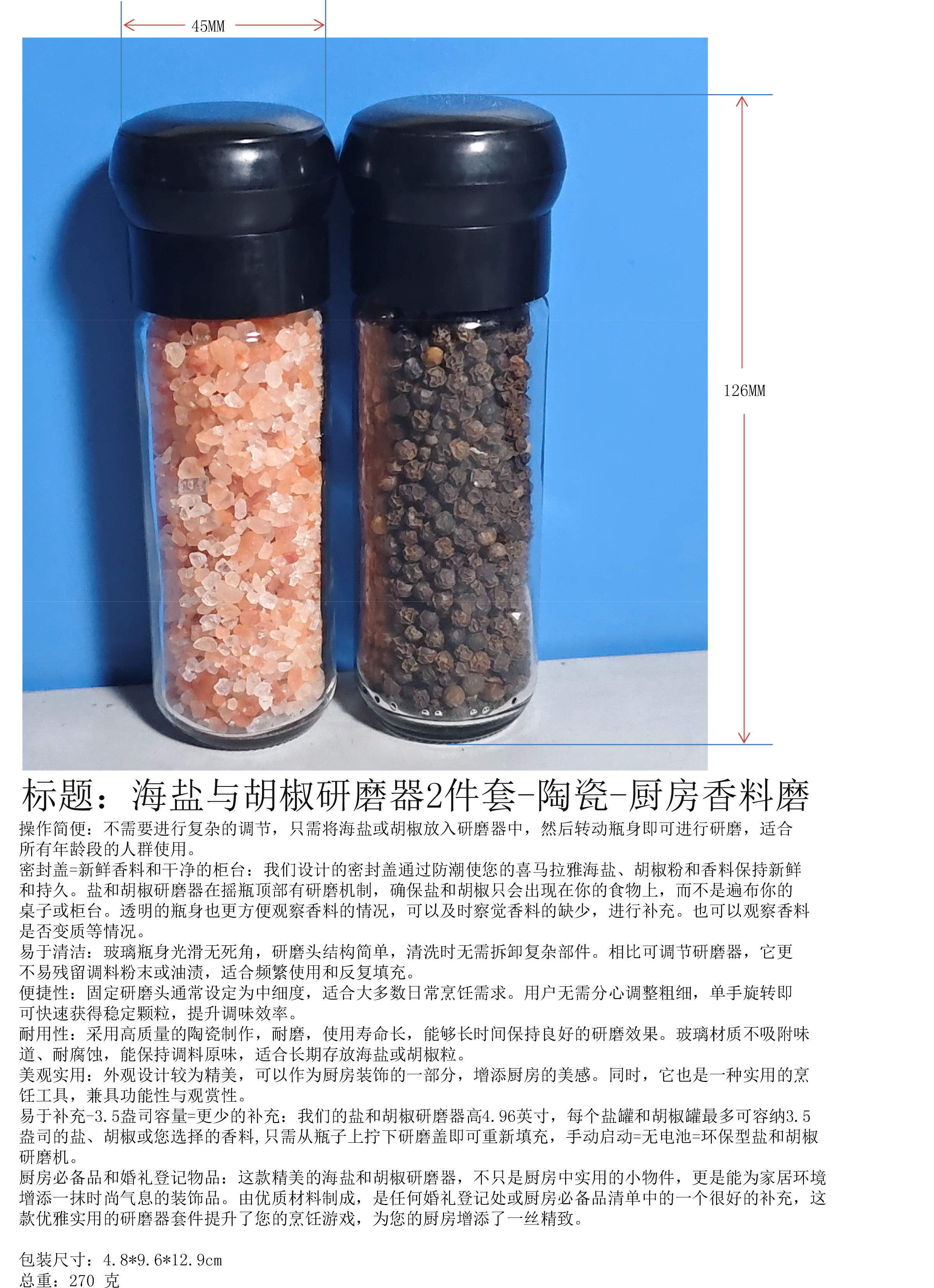Durability: Made of high-quality ceramics, it is wear-resistant, has a long service life, and can maintain good grinding effect for a long time. Glass material does not absorb odors, is corrosion-resistant, and can maintain the original flavor of seasonings. It is suitable for long-term storage of sea salt or pepper.