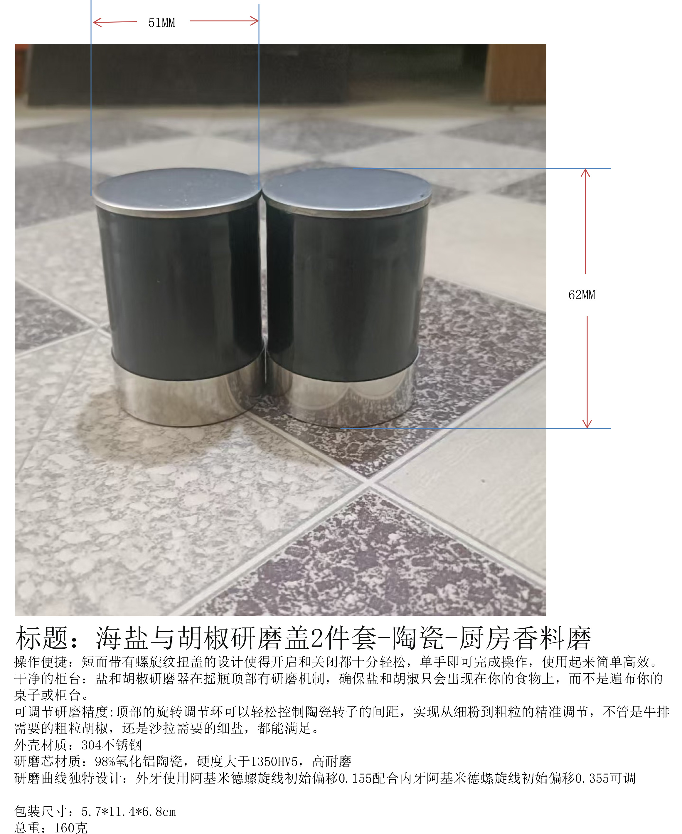 Product Name: 2-piece set of sea salt and pepper grinding cover - Ceramic - Kitchen spice grinder